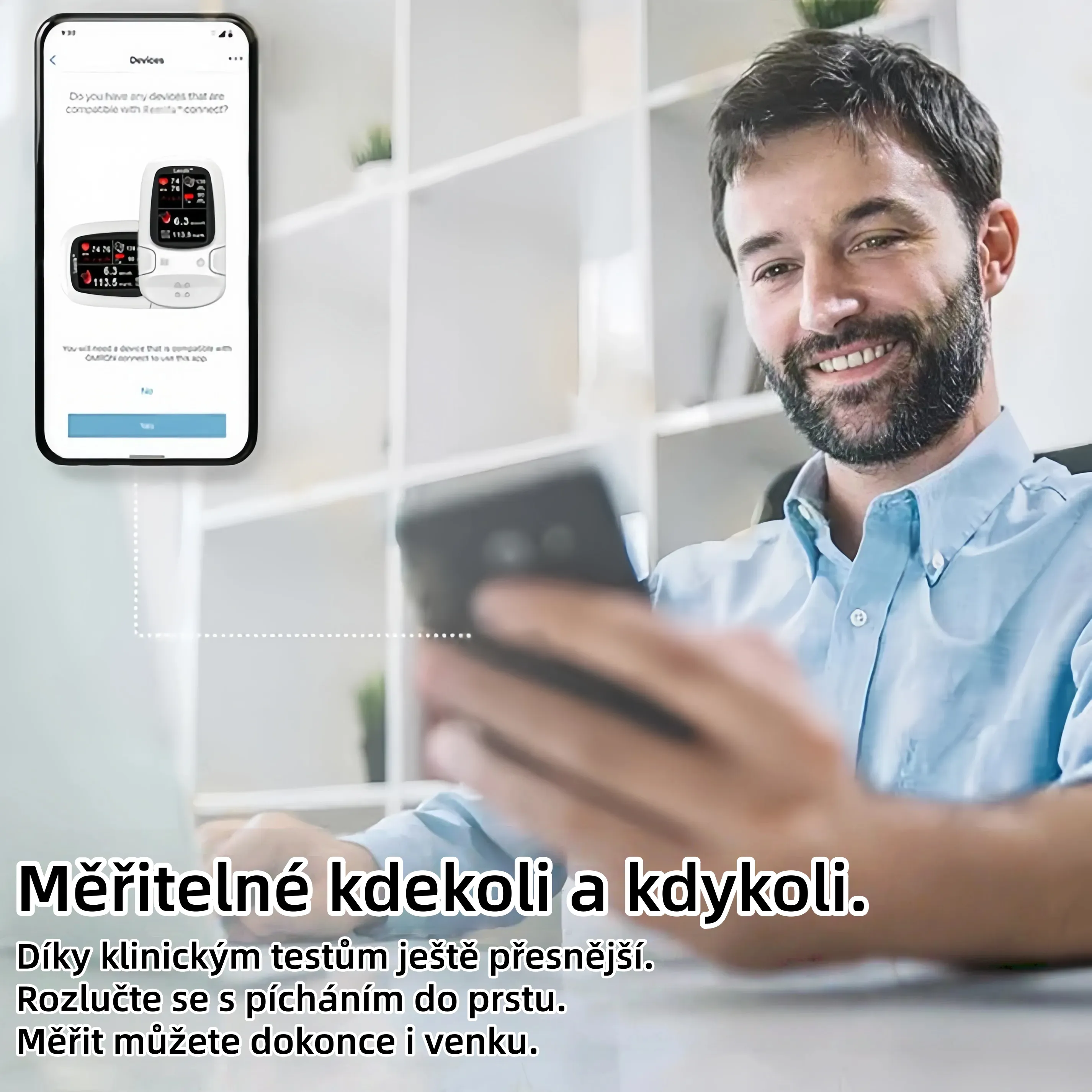 Neinvazivní technologie bez propíchnutí - měřte kdekoli a kdykoli bez bolesti.