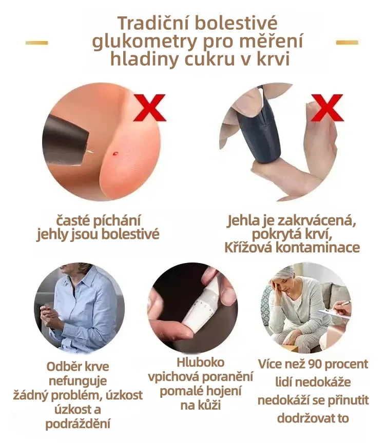 Už žádné invazivní a riskantní testování hladiny cukru v krvi! Otestujte si hladinu cukru v krvi bezpečně bez rizika křížové infekce nebo poranění prstů jehlou.